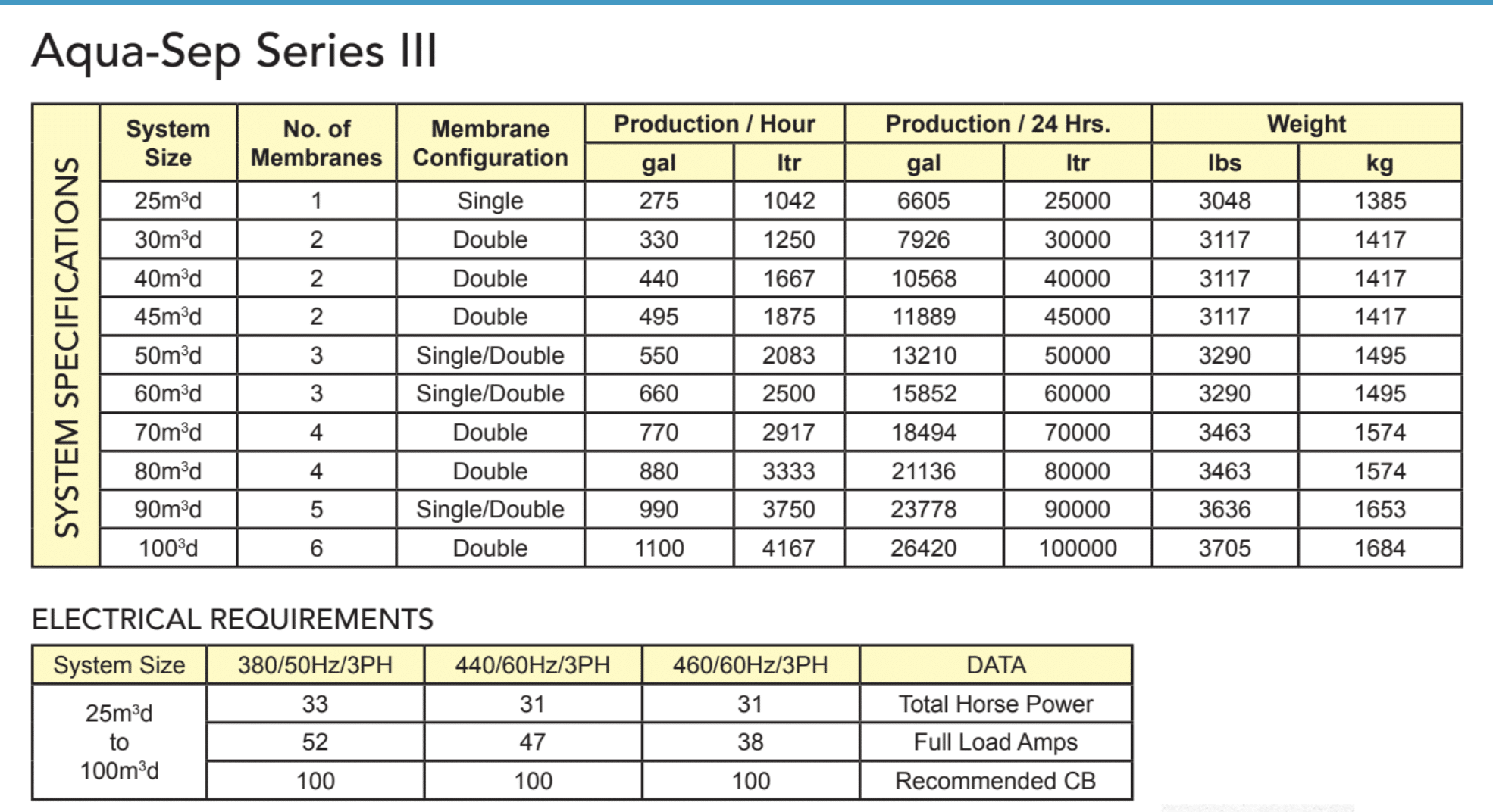 The AQUA-SEP® Series III™ Reverse Osmosis Fresh Water Maker delivers reliable, high-quality potable water for vessels, even under the most demanding conditions. The AQUA-SEP® Series III™ can deliver between 25 m3/day to 100 m3/day of potable water with Total Dissolved Solids (TDS) less than 500 ppm for use on your vessel daily. This system works tirelessly under the most demanding conditions. This system can be combined with a second pass system for technical water with TDS less than 10 ppm for use in boilers. This model supports a compact footprint to ensure a seamless fit into any vessel in your fleet.